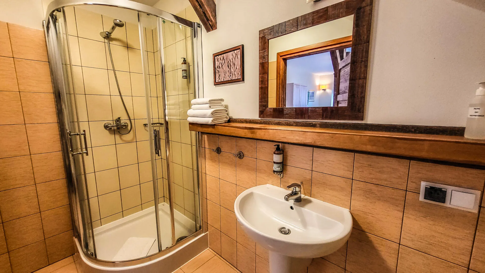 - łazienka z WC, umywalką i prysznicem