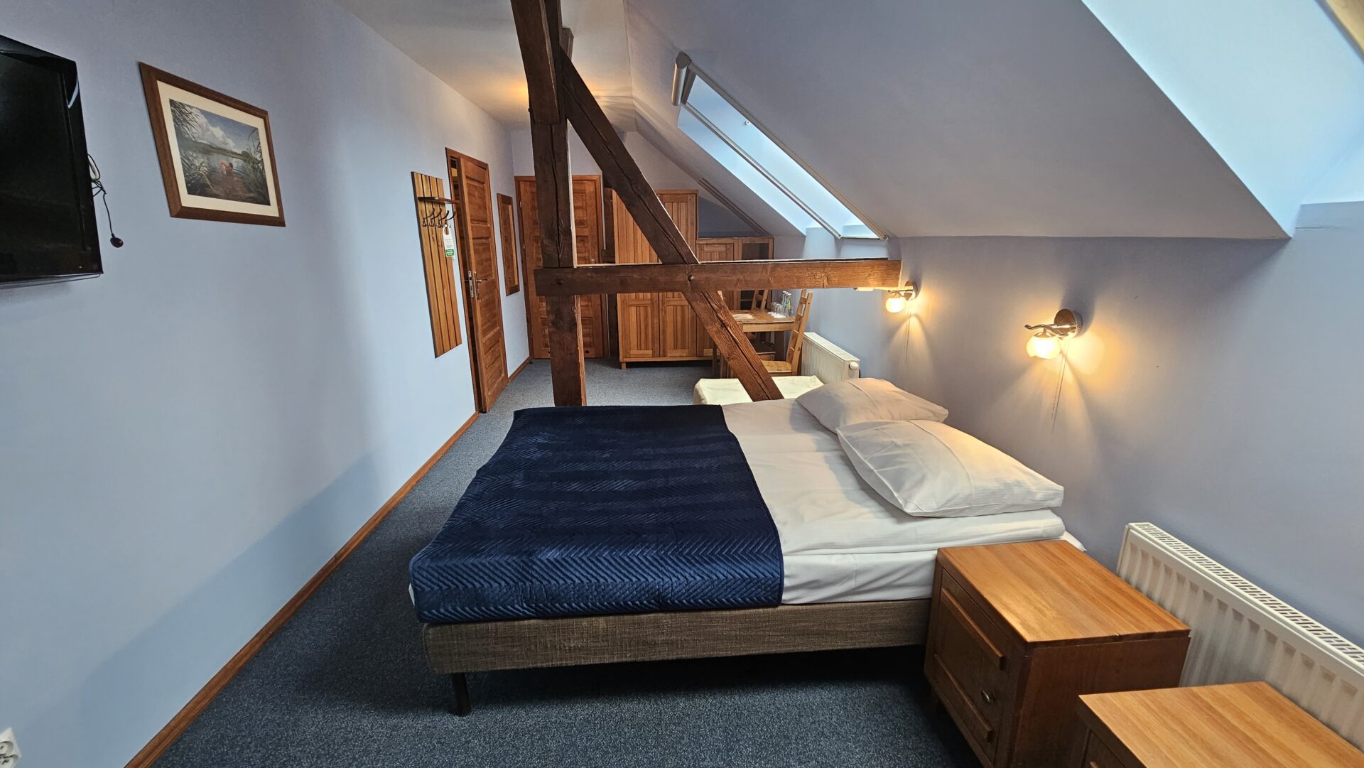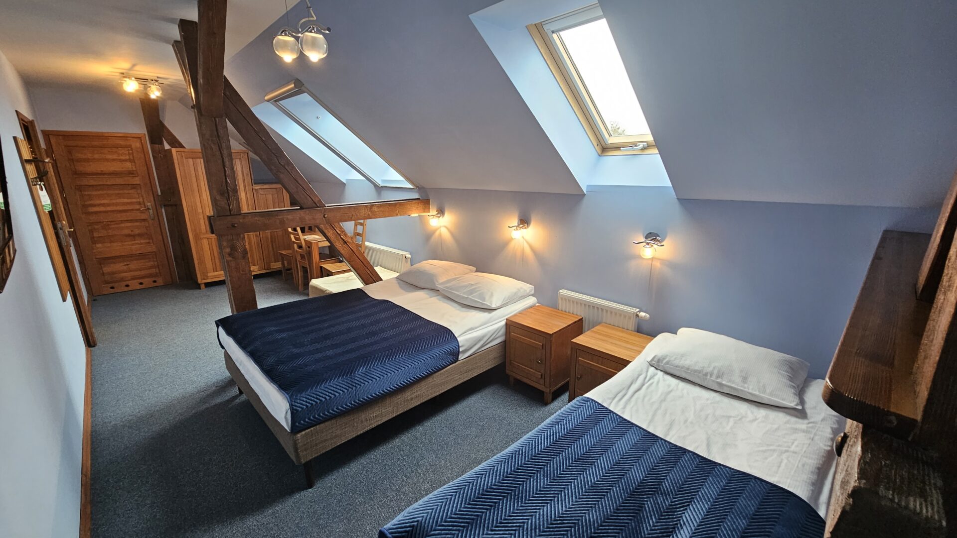Oferujemy wygodne, przestronne pokoje z łazienkami dla 3 lub 4 osób w odrestaurowanym XIX wiecznym spichlerzu. Pokoje mają podłużny układ, z częściami sypialną i „dzienną” oddzielonymi stuletnią stylową więźbą dachową.