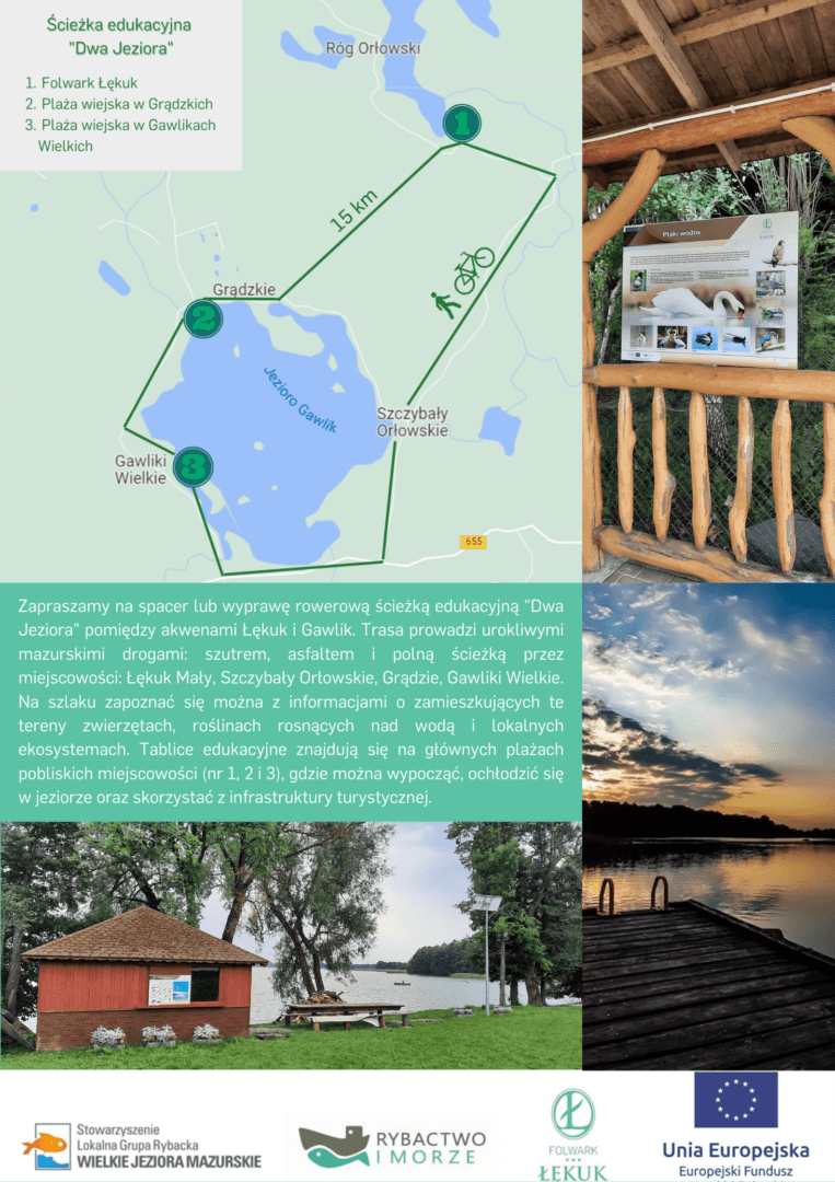 Zapraszamy na spacer lub wyprawę rowerową ścieżką edukacyjną „Dwa Jeziora” pomiędzy akwenami Łękuk i Gawlik. Trasa prowadzi urokliwymi mazurskimi drogami: szutrem, asfaltem i polną ścieżką przez miejscowości: Łękuk Mały, Szczybały Orłowskie, Grądzie, Gawliki Wielkie. Na szlaku zapoznać się można z informacjami o zamieszkujących te tereny zwierzętach, roślinach rosnących nad wodą i lokalnych ekosystemach. Tablice edukacyjne znajdują się na głównych plażach pobliskich miejscowości (nr 1, 2 i 3), gdzie można wypocząć, ochłodzić się w jeziorze oraz skorzystać z infrastruktury turystycznej.
